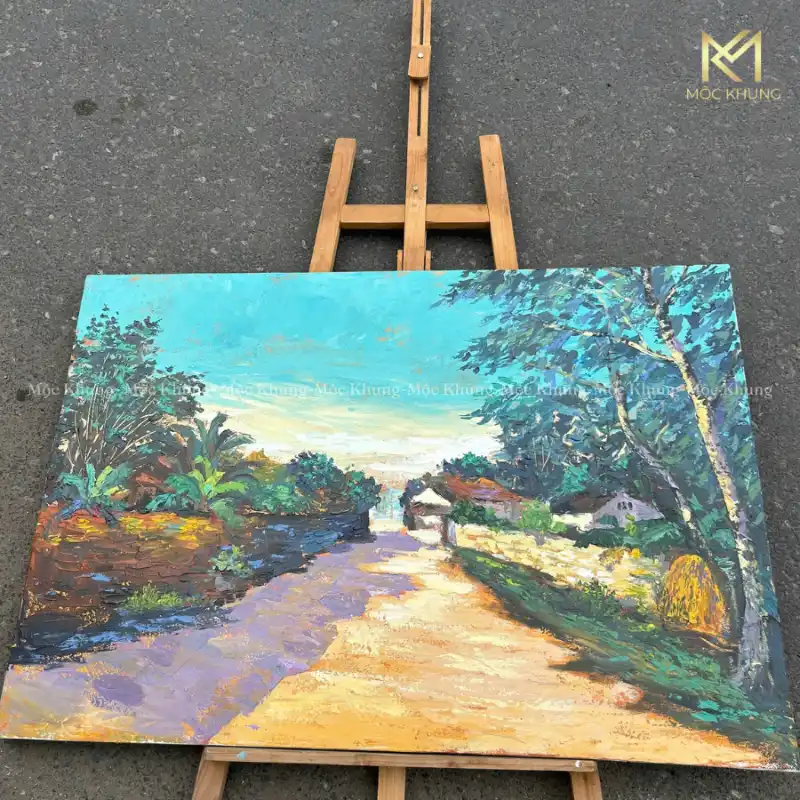 Tranh sơn dầu con đường làng quê là bức tranh được vẽ lại cảnh con đường nhỏ nằm giữa hai bên bờ cây để đi vào làng. Cùng với hình ảnh đường làng quê nhỏ là cánh đồng rộng lớn bao la trải dài tít tắp. Bức tranh vừa mang vẻ mộc mạc bình dị đẹp chân phương, lại vừa giúp căn phòng như rộng rãi hơn, thoáng đãng hơn. Bức tranh này được các họa sỹ vẽ với khổ tranh nhỏ. Nếu thích quý vị hoàn toàn có thể đặt vẽ theo mẫu này khổ tranh to hơn đều được. Tranh được vẽ hoàn toàn bằng sơn dầu do chính họa sỹ Việt Nam vẽ nên quý vị hoàn toàn yên tâm về chất lượng.
