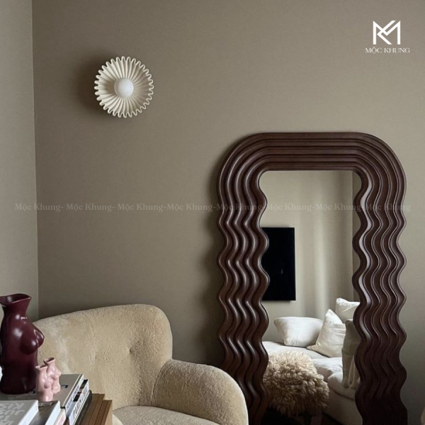 Gương soi toàn thân với khung gỗ dày dặn màu nâu trầm, nổi bật với kiểu dáng sóng lượn chạy dọc theo viền. Thiết kế này mang lại cảm giác vui tươi, phá cách, đậm chất Retro hoặc Memphis Design, tạo điểm nhấn mạnh mẽ và nghệ thuật cho mọi không gian.