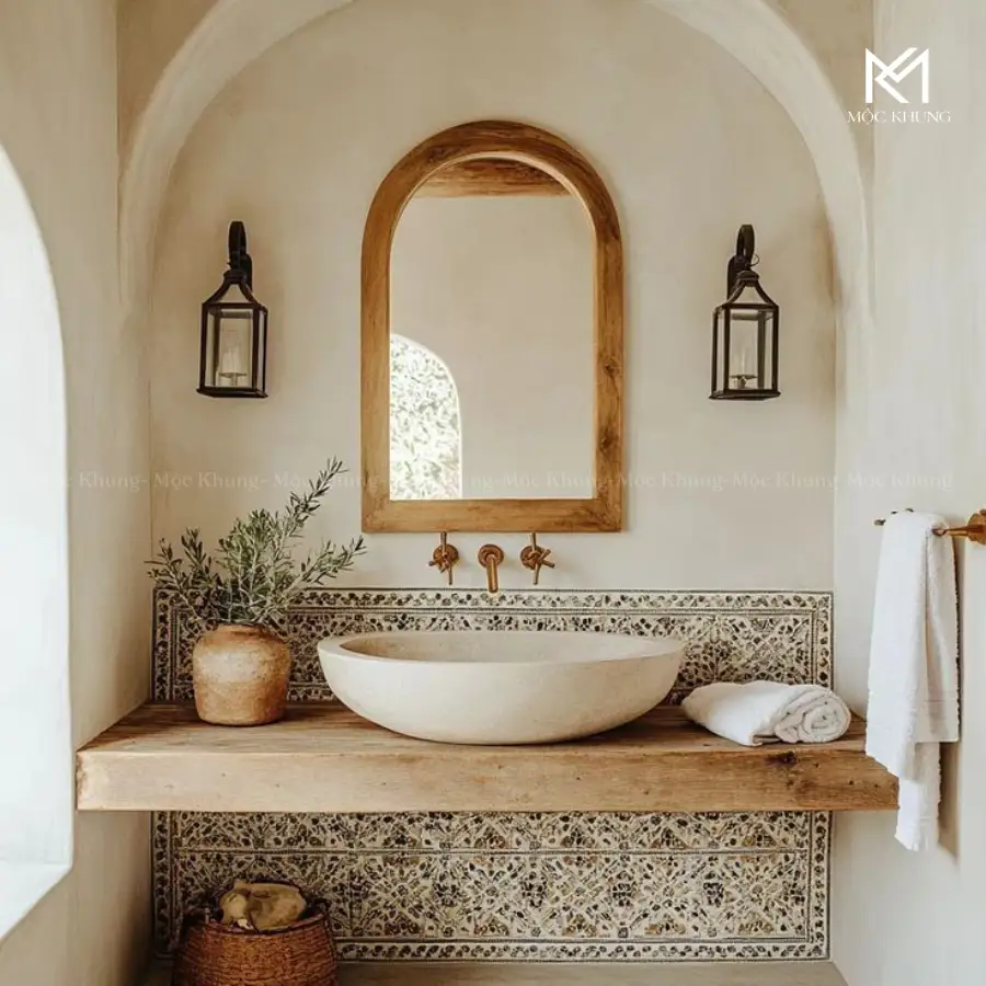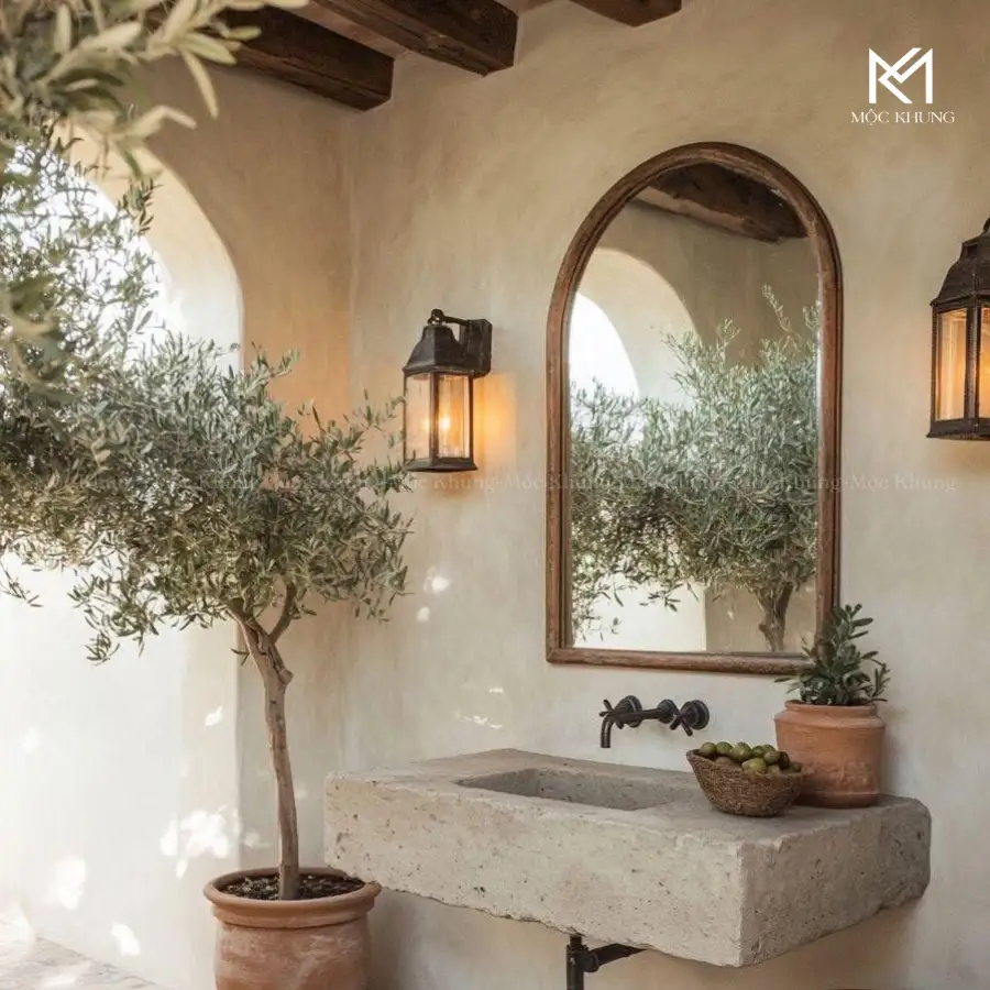 Thiết kế nghệ thuật: Đường cong mềm mại kết hợp vật liệu thô mộc tạo nên vẻ đẹp tự nhiên nhưng tinh tế. Gương phản chiếu ánh sáng và cây xanh, giúp không gian trở nên ấm áp và sống động.