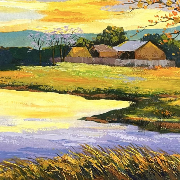 Khung tranh phong cảnh “Chiều thu bên hồ” mang đến cảm giác bình yên và lãng mạn của đồng quê Việt Nam. Hình ảnh ánh hoàng hôn phủ sắc vàng ấm lên mặt hồ phẳng lặng, những mái nhà nhỏ nằm nép mình giữa thiên nhiên và tán cây mùa thu thay lá tạo nên một bố cục hài hòa, giàu cảm xúc.