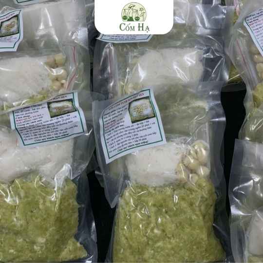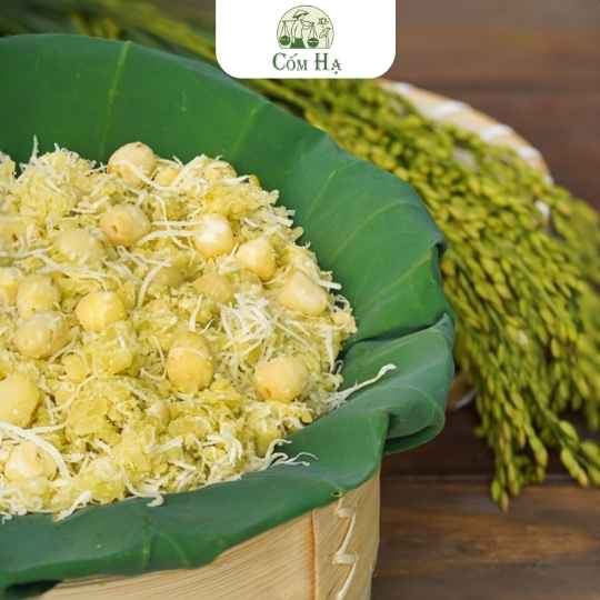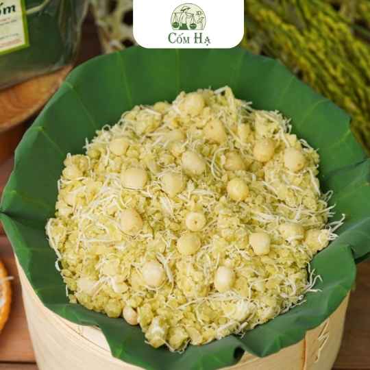 Thành phần: Cốm tươi, hạt sen, đậu xanh sên nhuyễn, dừa nạo.